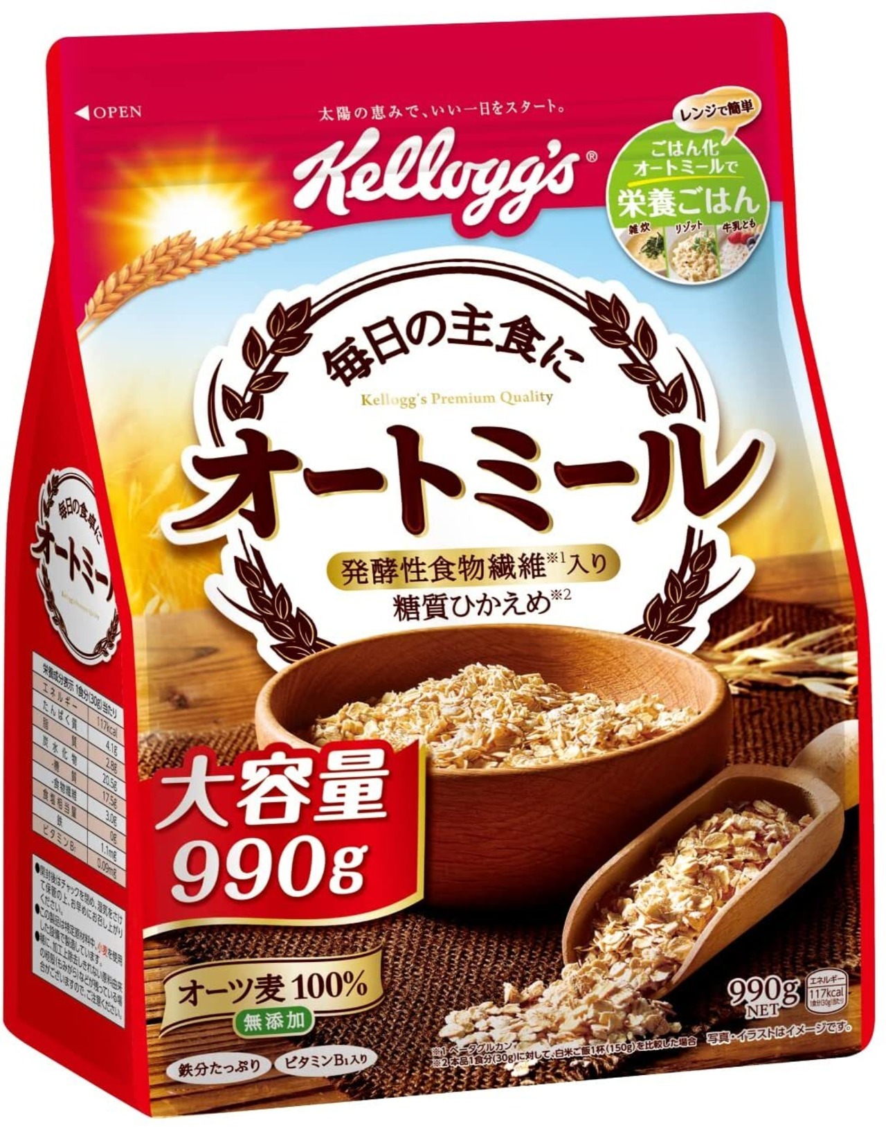 発酵性食物繊維*(*ベータグルカン)を含むオーツ麦100%を原料とし、無添加のオートミール(インスタントオーツ)。